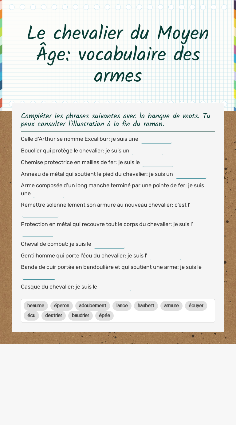le chevalier du moyen age vocabulaire des armes interactive worksheet by valerie badet wizer me