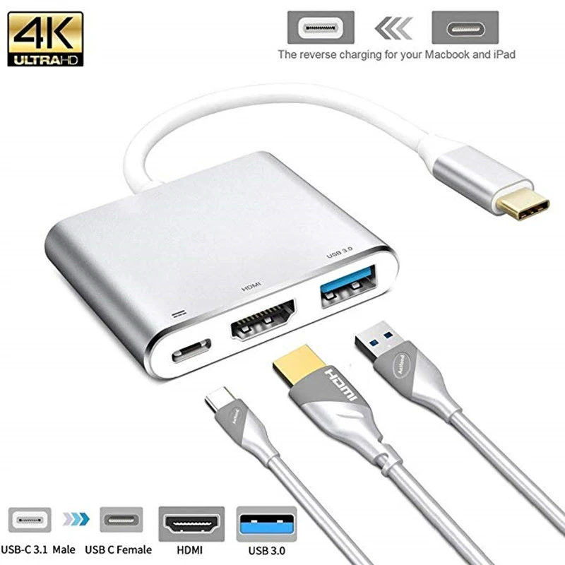 amazon com xvz usb c to hdmi 4k multiport adapter 3 in 1 type c hub with usb 3 0 usb c charging port digital converter compatible for macbook chromebook pixel dell xps13 samsung galaxy s8 s8