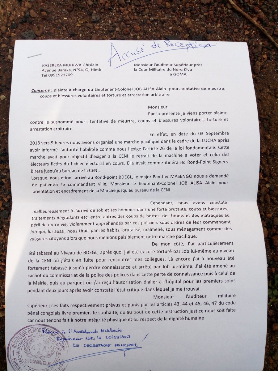 ghislain muhiwa kasereka a twitteren urgent je viens de deposer a l auditorat superieur pres de la cours militaire du nord kivu une plainte contre le commandant de la police de goma job alisa