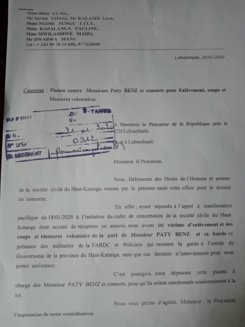 me tshiswaka masoka hubert a twitter lubumbashi encourageons les acteurs de la societe civile a porter plainte contre monsieur patty benz zingi pour coups et blessures volontaires et enlevements toute obstruction a